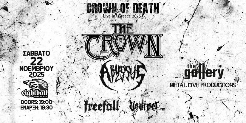 Μετά από τριάντα πέντε χρόνια αδιάκοπης πορείας και δώδεκα άλμπουμ που καθόρισαν τον ήχο του μελωδικού Death/Thrash Metal, οι THE CROWN επισκέπτονται για πρώτη φορά την Ελλάδα. Οι δύο συναυλίες τους σε Θεσσαλονίκη και Αθήνα, στο πλαίσιο των Death Metal συναυλιών «Crown of Death», αποτελούν ορόσημο για την εγχώρια Metal σκηνή, σηματοδοτώντας την πολυαναμενόμενη άφιξη μιας μπάντας που εδώ και δεκαετίες κρατά αμείωτη τη φλόγα του ακραίου ήχου.
