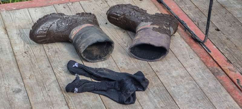 Waterproof hiking boots are great but will work only until the mud chocolate pudding flows in from above, if cut too low. And once the strings are soaked, your hands get messy.